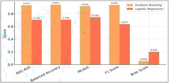 Gradient Boosting (orange-yellow) consistently outperformed calibrated logistic regression (coral) on discrimination (ROC-AUC), balanced accuracy, precision–recall AUC, F1 score, and calibration (Brier score). Bars represent mean values; annotations indicate exact scores. Diagnostic indices derived from the global confusion matrix confirmed high sensitivity (0.919), specificity (0.967), positive predictive value (0.961), and negative predictive value (0.930) at a classification threshold of 0.50.