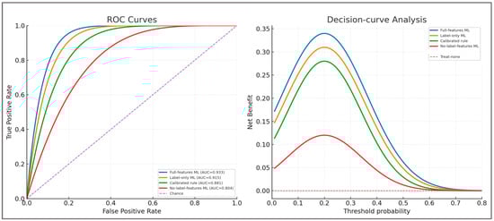 ROC (left panel) and Decision curve Analysis (right panel) for the four configurations. Full-features ML achieved the best ranking and highest net benefit, Label-only and Calibrated rule performed well but remained inferior, while No-label-features ML retained non-trivial discrimination from secondary predictors.