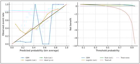 Calibration plots show the alignment between predicted and observed outcomes for Gradient Boosting, calibrated logistic regression, and the calibrated rule score, with the diagonal representing ideal calibration. Ten equally spaced reliability bins were used, and bin counts are displayed to visualize the distribution of predicted probabilities. The Expected Calibration Error (ECE < 0.02) and Maximum Calibration Error (MCE < 0.05) were computed using 2000× bootstrap resampling, confirming excellent probability calibration across all configurations. Decision curve analysis displays net benefit across threshold probabilities for the same models, compared to “treat-all” and “treat-none” reference strategies.