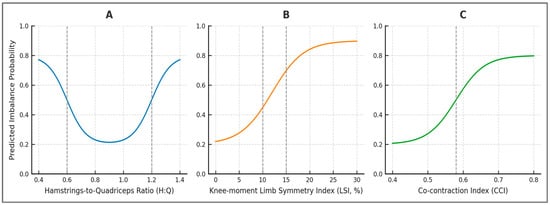 Partial dependence plots (PDPs) for key predictors of imbalance. (A) Dynamic H:Q ratio, (B) Knee moment LSI, and (C) Co-contraction Index (CCI). Each plot shows the marginal relationship between the predictor and imbalance probability, highlighting clinically relevant thresholds (H:Q < 0.6/>1.2, LSI > 12%, CCI > 0.58).