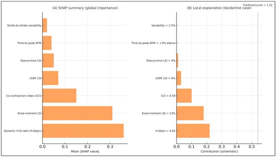 Local interpretability (SHAP)—To complement global PDPs, SHAP analyses were computed on out-of-fold predictions. A SHAP summary plot confirmed that H:Qdyn and knee moment LSI consistently had the strongest contributions, while CCI acted additively. SHAP analyses illustrate both global and local feature contributions, showing how deviations in H:Qdyn, LSI, and CCI shift the predicted probability of imbalance. Figure 8 highlights these effects, with enlarged labels and improved spacing for enhanced readability. Local SHAP plots for borderline cases (H:Qdyn ≈ 0.60–0.65, LSI ≈ 12–15%) showed how small shifts in these predictors directly influenced predicted risk, reproducing the same gray zones encountered in clinical decision-making. Representative SHAP visualizations (global summary and a borderline case) are provided in Figure 8.