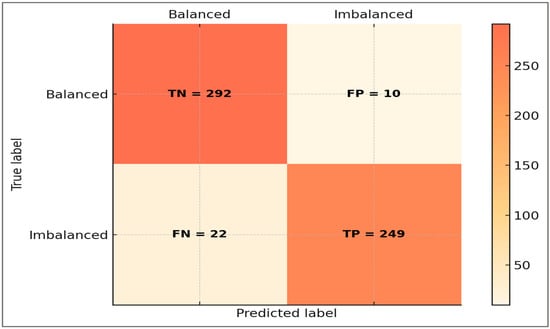 Diagnostic indices derived from the global confusion matrix (TP = 249, TN = 292, FP = 10, FN = 22) were as follows: Sensitivity = 0.919 (95% CI: 0.893–0.944), Specificity = 0.967 (95% CI: 0.950–0.981), Positive Predictive Value (PPV) = 0.961 (95% CI: 0.938–0.979), Negative Predictive Value (NPV) = 0.930 (95% CI: 0.903–0.954), and Accuracy = 0.943 (95% CI: 0.924–0.962). Likelihood ratios were LR+ ≈ 28 and LR– ≈ 0.08. These values confirm that the framework correctly identifies the majority of imbalanced athletes while maintaining high reliability for negative predictions.