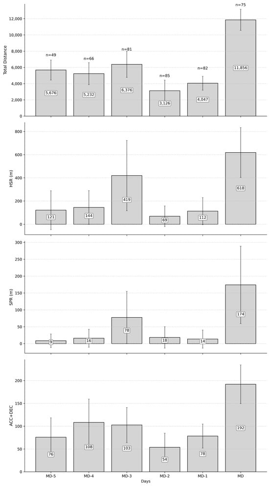 External load metrics faced by elite soccer players per day during the typical soccer microcycle of 2 consecutive seasons. This typical microcycle follows the tactical periodization principles, with the most observed type of training for MD-5, MD-4, MD-3, MD-1, and MD corresponding to aerobic (n = 37), strength (n = 38), endurance (n = 41), activation (n = 69), and match (n = 75) [24]. Only MD-2 varies across the season with different types of training (i.e., technical/tactical, speed, recovery). HSR, SPR, ACC + DEC stand for the distance covered between 19.8 and 25.2 km∙h−1, above 25.2 km∙h−1, and the sum of accelerations above 3 m∙s−2, and decelerations below 3 m∙s−2, respectively.