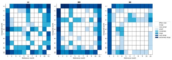 Heatmap of the pairwise comparison between months for the training volume measured through heart rate (HR) during two consecutive seasons of an elite soccer team. Coloured cells correspond to significant differences (p < 0.05), and the colour highlights the value of the effect size (i.e., adjusted Cohen’s d). LI, MI, and HI stand for the time spent below 80%, between 80% and 90%, and above 90% of maximal HR, respectively. Trivial, very small, small, moderate, large, very large, and extremely large correspond to an adjusted Cohen’s d value of <0.01, 0.01–0.2, 0.2–0.5, 0.5–0.8, 0.8–1.2, and >1.2, respectively.