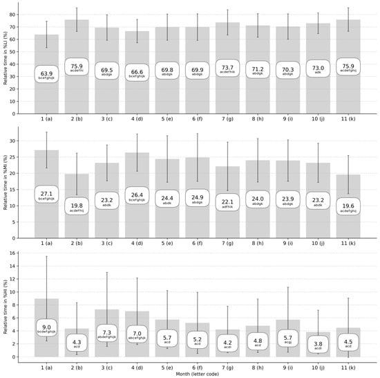 Figure 3 summarizes the relative time spent in HR zones per month across the two competitive seasons and the significant differences observed between months (p < 0.05, small to very large). The associated effect sizes of interday differences are described in Supplementary Figure S2. No significant difference was observed for playing position.