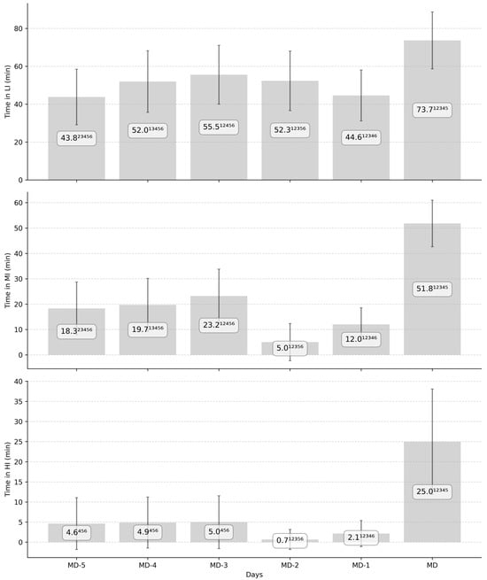 Absolute time spent in heart rate (HR) zones regarding the number of days before the next match. The presented results highlight the average time spent in each HR zone and the associated standard deviation measured in an elite soccer team following a tactical periodization during two consecutive seasons. MD-5, MD-4, MD-3, MD-2, and MD-1 correspond to the training day with 5, 4, 3, 2, 1 days until the next match, while MD corresponds to the match day. LI, MI, and HI express the time spent between 0% and 80%, 80% and 90%, and 90% and 100% of maximal players’ HR. Numbers 1, 2, 3, 4, 5, and 6 describe a significant difference with MD-5, MD-4, MD-3, MD-2, MD-1, and MD, respectively (p < 0.001; small to extremely large).