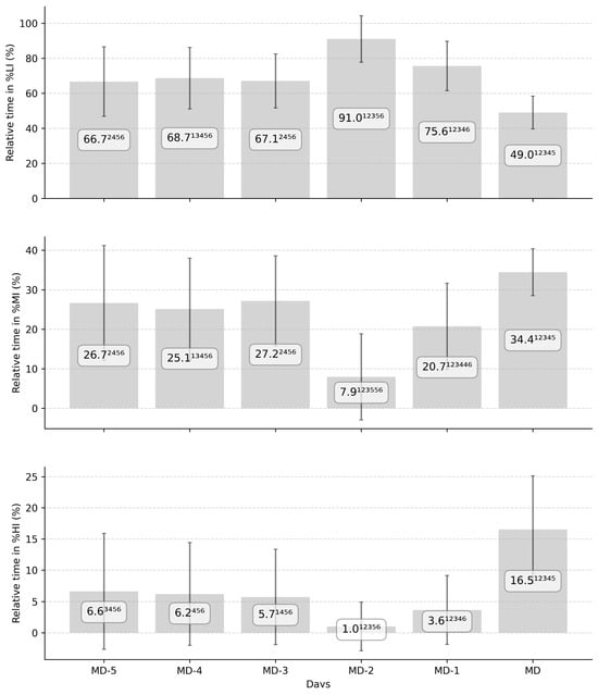 Repartition of average relative training time spent in heart rate (HR) zone (in percentage of total time) per days before the match and the associated standard deviation during two consecutive elite soccer seasons. MD-5, MD-4, MD-3, MD-2, and MD-1 correspond to the training day with 5, 4, 3, 2, and 1 days until the next match, while MD corresponds to the match day. %LI, %MI, and %HI represent the percentage of training time spent between 0% and 80%, 80% and 90%, and 90% and 100% of players’ maximal HR. Numbers 1, 2, 3, 4, 5, 6 describe a significant difference with MD-5, MD-4, MD-3, MD-2, MD-1, and MD, respectively (p < 0.01; very small to extremely large).