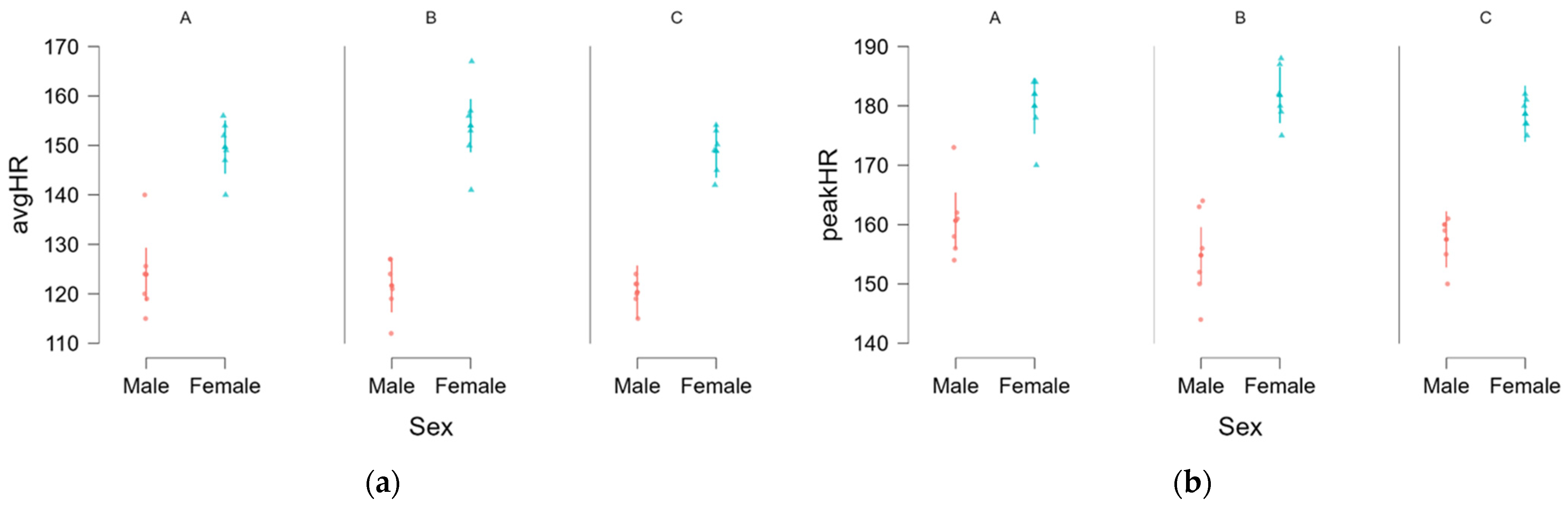 - Schram, B.; Orr, R.; Niederberger, B.; Givens, A.; Bernards, J.; Kelly, K.R. Cardiovascular Demand Differences Between Male and Female US Marine Recruits During Progressive Loaded Hikes. J. Strength Cond. Res. 2024, 38, e454–e458. [Google Scholar] [CrossRef]