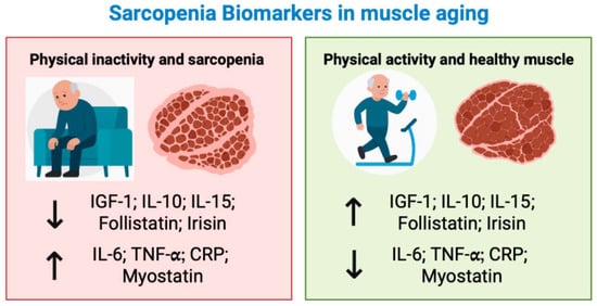 Sarcopenia is a progressive and generalized loss of skeletal muscle mass, strength, and function, primarily associated with aging but also exacerbated by chronic diseases such as type 2 diabetes, cardiovascular disease, and cancer, with profound implications for mobility, independence, and quality of life [1,2,3]. Initially defined by Rosenberg in 1989 as a loss of muscle mass, the condition has been redefined to include not only quantitative but also qualitative impairments, encompassing declines in strength and physical performance [4,5,6]. Based on criteria such as low muscle strength, reduced muscle quantity, and impaired physical performance, sarcopenia is now stratified into probable, confirmed, and severe stages [1,7]. Prevalence increases with age, affecting 10–27% of adults over 60 and up to 50% beyond the age of 80 [8,9], with even higher rates reported in hospitalized and institutionalized populations [1,10]. Sarcopenia is associated with increased risks of frailty, falls, fractures, metabolic dysfunction, hospitalization, and mortality, contributing to a growing burden on healthcare systems [11,12,13,14]. While no pharmacological treatments have yet been approved, lifestyle-based interventions remain the cornerstone of prevention and management. Resistance and multicomponent exercise training have shown strong evidence in preserving muscle mass, strength, and mitochondrial function, while nutritional strategies, including protein and vitamin D supplementation, further support muscle maintenance [15,16,17,18,19]. Aging is accompanied by complex changes in muscle tissue, including fiber atrophy, fatty infiltration, and reduced regenerative capacity [5,20,21]. These alterations are aggravated by “inflammaging,” a state of chronic low-grade inflammation characterized by increased levels of pro-inflammatory cytokines, which impair anabolic signaling and contribute to sarcopenia progression [22,23,24]. Sedentary behavior further exacerbates this inflammatory state, a concept referred to as “inflamm-inactivity” [10,25]. In this context, biomarkers have emerged as promising tools not only for diagnosing sarcopenia but also for tracking its progression and evaluating responses to interventions [26]. Of particular interest are cytokines, growth factors, and muscle-derived peptides, which may act as both indicators and active mediators of muscle remodeling. Skeletal muscle is now recognized as a secretory organ capable of producing myokines, cytokines specifically released during muscle contraction, that influence systemic physiology [11,27,28]. Building on this concept, the broader term “exerkines” has been introduced to refer to all exercise-induced molecules, regardless of tissue origin, that exert local or systemic effects on health [29,30,31]. These include not only myokines (from muscle), but also hepatokines (from the liver), adipokines (from adipose tissue), metabolites, and extracellular vesicle cargo. Their expression and release are influenced by exercise type, intensity, duration, and by individual factors such as age, sex, and nutritional status [31].