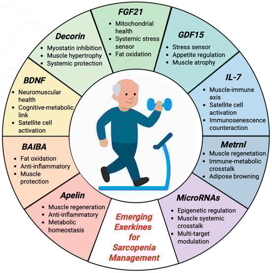 Several biomarkers have been associated with skeletal muscle health and sarcopenia and show potential as both diagnostic and therapeutic targets, yet many remain insufficiently explored in the context of physical activity. Further research is needed to clarify their role as exerkines and their relevance in personalized exercise-based interventions against sarcopenia (Figure 2).