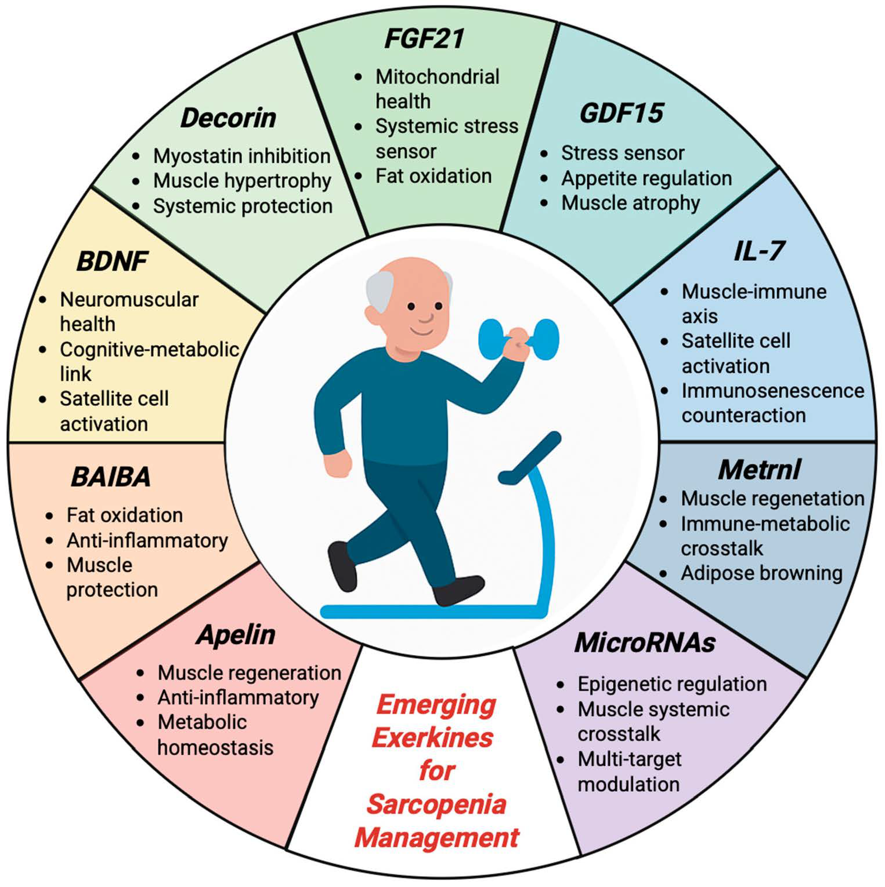 - Magliulo, L.; Bondi, D.; Pini, N.; Marramiero, L.; Di Filippo, E.S. The wonder exerkines—Novel insights: A critical state-of-the-art review. Mol. Cell. Biochem. 2022, 477, 105–113. [Google Scholar] [CrossRef]