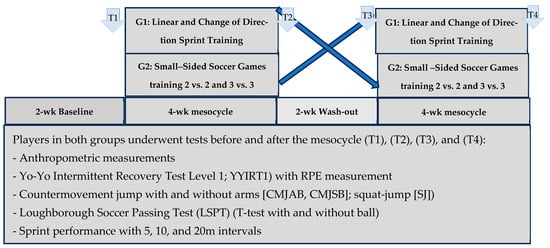 Figure 1 illustrates the general design of the randomized crossover experiment and all variables assessed during training and field testing. The experiment was conducted in the middle of the competitive season, beginning approximately eight weeks after the start of the competition phase and lasting approximately twelve weeks in total. The players were monitored and debriefed during a two-week baseline period, then randomly assigned to two experimental groups: G1 and G2. After this two-week reference period, each group completed a four-week training mesocycle (three sessions per week) consisting of either LSCD or SSG. After a two-week washout period, participants switched interventions and completed the alternate four-week mesocycle. The session rating of perceived exertion (sRPE) was assessed at the end of each session to compare the load induced by each training program. The overall training loads were equivalent for both groups for both programs. The 2-week washout period between the training programs was conducted with little training (3 sessions per week) and training sessions at 50–60% of maximum heart rate [39,40], coinciding with a break during the season. Both groups were assessed before and after each of the two experimental cross-training mesocycles, for a total of four measurement points. All tests were performed on a third-generation synthetic field, after a standardized warm-up and under the supervision of the same evaluators. All players were already familiar with the physical test protocols, as these were part of their usual training and preparation. In addition to the specific experimental training sessions, participants continued to take part in their team’s usual activities, including technical and tactical training sessions and one official match per week. However, these additional sessions were mainly intended for preparation and recovery before matches, with no specific goal of improving physical performance, which was the exclusive objective of the experimental training program.