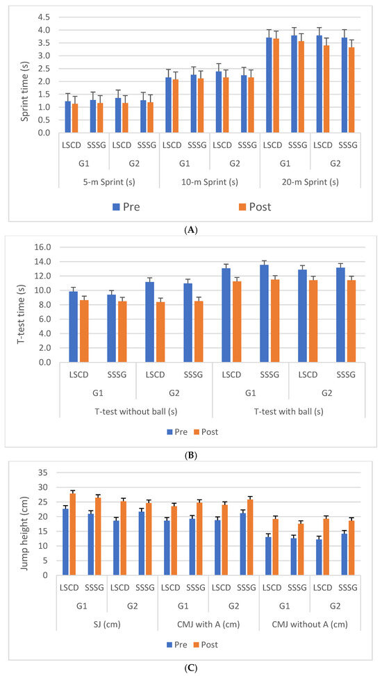 Effects of LSCD training compared to SSG training over 8 weeks on fitness variables. (A) Sprint time (s) for distances of 5 m, 10 m, and 20 m. (B) Performance time in the agility T test (s), with and without a ball. (C) Vertical jump height (cm) in the squat jump (SJ), countermovement jump with arms (CMJ with A) and countermovement jump without arms (CMJ without A). Data are presented as the mean and standard deviation. SJ: squat jump, CMJ with A: countermovement jump with arm, CMJ without A: countermovement jump without arm, LSCD: linear sprint and change of direction, SSSG: small-sided soccer games.