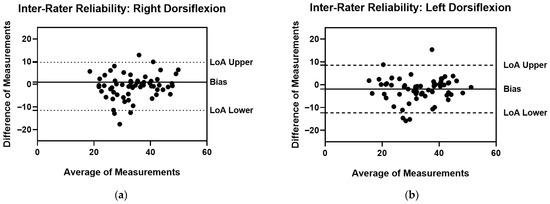 Inter-Rater Reliability Bland–Altman plots with Bias, LoA Lower and LoA Upper (a) Right Dorsiflexion ROM Measurements; (b) Left Dorsiflexion ROM Measurements.