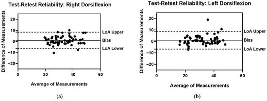 Test–retest Reliability Bland–Altman plots with Bias, LoA Lower and LoA Upper (a) Right Dorsiflexion ROM Measurements; (b) Left Dorsiflexion ROM Measurements.