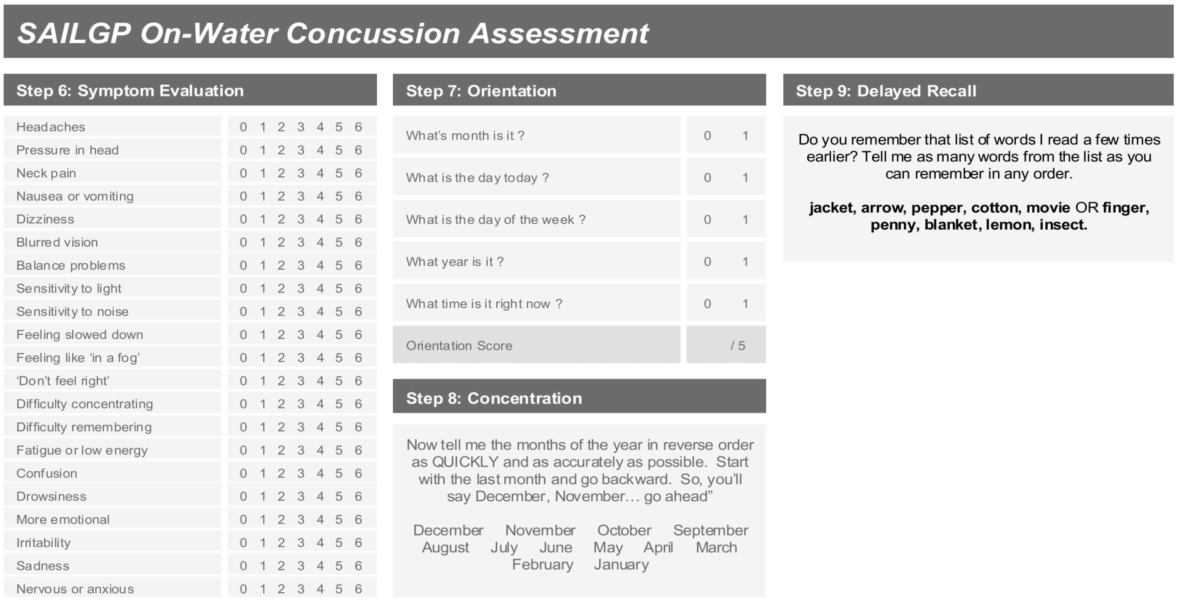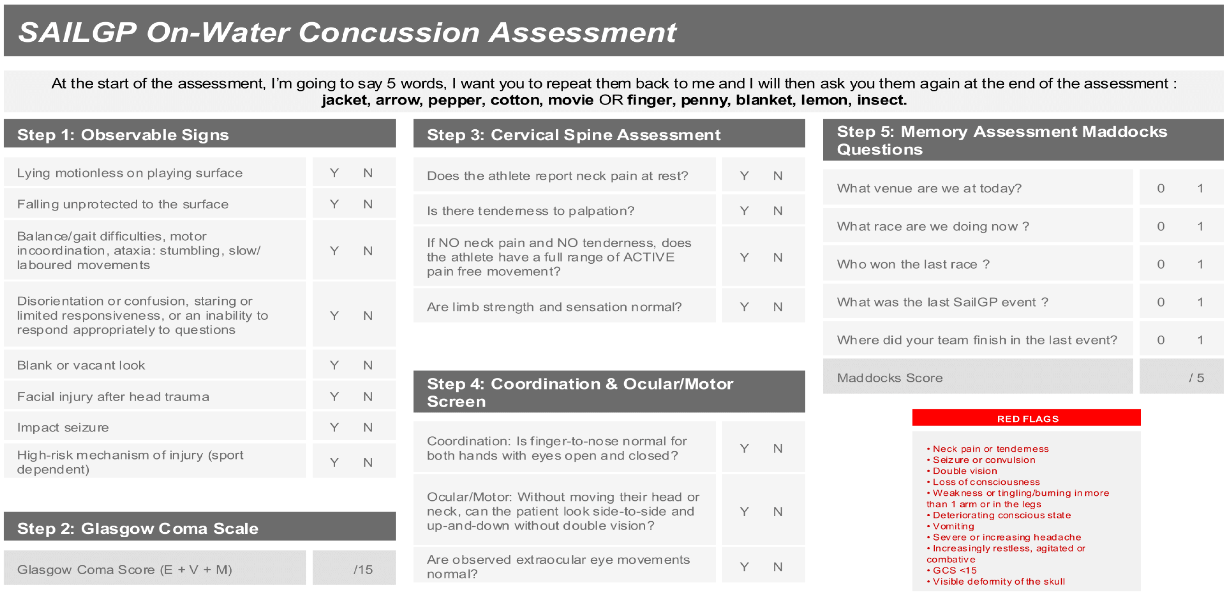SailGP—A Proposed Concussion Management Tool (Appendix A) This article has highlighted the significant gap in sailing-specific concussion assessment tools. The SailGP on-water concussion assessment tool is a guideline specifically focusing on and outlining the acute assessment of sailing-related concussions within this professional sailing league and is based on the consensus statement on concussion in sport [