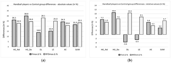 Figure 1a displays the percentage differences in the examined muscle groups (variables) between the two groups, based on the absolute values of Fmax and RFDmax. The results show that in the case of the absolute values of Fmax and RFDmax between the handball players and the control group (Table 1 and Table 2, Figure 1a), there are statistically significant differences in all pairs of variables as well as from DL_Fmax—p = 0.001; Part. Eta2 = 0.156; 14.0%—to HG_Fmax_Do—p = 0.000; Part. Eta2 = 0.436; 30.0%—and from LE_RFDmax—p = 0.004; Part. Eta2 = 0.125; 25.0%; to HG_RFDmax_Do—p = 0.000; Part. Eta2 = 0.270; 24.6%—respectively.