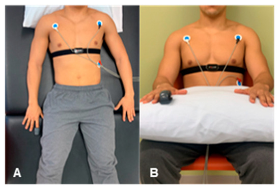 The testing protocol did not differ across testing sessions. Prior to any data collection in either position, 5 min of stabilization in both supine and sitting occurred to minimize the influence of body position change, which is consistent with resting HRV data collection procedures [40,41]. After each stabilization, 5 min of R-R interval data were then collected using a spontaneous breathing pattern, first in supine (Figure 1A), and secondly in the seated (Figure 1B) position. Participants were given no breathing instructions to be consistent with other field-based HRV data collection methods [42].