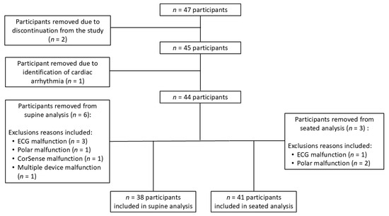 A cardiac arrythmia was observed during data collection for one participant, and as a result, they were excluded from analyses, leaving 44 participants for initial analyses (age: 23.13 ± 4.45 yrs; height: 170.21 ± 9.08 cm; body mass: 74.14 ± 16.50 kg) (Figure 2). In addition, six people were removed from the supine analyses due to three ECG device malfunctions, one PPG device malfunction, one Polar HRM malfunction, and one multiple device malfunction (Figure 2) for a total of 38 participants (20 females, 18 males) included in the supine analyses (Table 1). Finally, three other participants were removed from the seated analysis due to one ECG device malfunction, and two Polar HRM device malfunctions (Figure 2) for a total of 41 participants (21 females, 20 males) included in the seated analyses (Table 1).