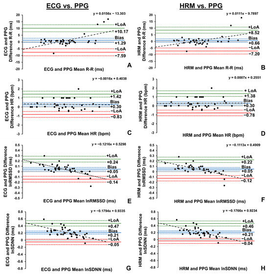 Bland–Altman plots demonstrating the mean bias, limits of agreement (LoA), respective 95% confidence intervals (CIs), and slope of linear regression line of R-R interval (A), heart rate (HR, C), natural log of root mean square of successive differences (lnRMSSD, E), and natural log of standard deviation of normal R-R intervals (lnSDNN, G) collected by photoplethysmography (PPG) sensor and electrocardiography (ECG) devices, and the mean bias, LoA, respective CIs, and slope of linear regression line of R-R interval (B), HR (D), lnRMSSD (F), and lnSDNN (H) collected by PPG sensor and chest heart rate monitor (HRM) devices in the seated position (n = 41).