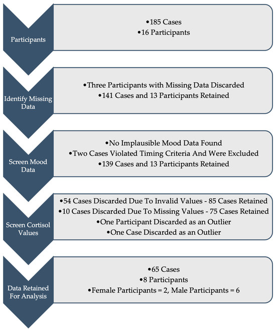 Data provided by the 16 participants comprised 185 cases, one for each game officiated, which were carefully screened for inclusion in the analysis. Data were scrutinised in several steps (Figure 1). The first step was to identify missing data. Missing cortisol data reduced the number of participants from 16 to 13, leaving 141 cases. The next step was to screen the remaining cases for implausible or out-of-range data, and non-normal distributions. Mood data were screened for implausible response patterns, but none were found. However, two cases violated the timing criteria for completion of the mood scale (between 30 and 45 min prior to game commencement) and were removed from the dataset. Regarding non-normality among the mood data, significant deviation from univariate normality was expected given that the distribution of negative mood scores typically trends towards the lower end of the scale [56,57]. Positive skewness ranged from 1.46 to 8.12 for tension, depression, anger, and confusion scores. Kurtosis values were high, ranging from 2.27 to 66.0 for all subscales except vigour. After checking each case individually, no evidence of response bias was found [58,59] and therefore 139 cases were retained at this stage and no data transformations occurred.