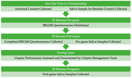 The methods and timelines involved in data collection were identical for each championship week (Figure 2). Participants’ informed consent and baseline salivary cortisol samples were collected at the pre-competition umpire meetings scheduled by the tournament Umpire-in-Chief. Baseline samples were provided at approximately 7:50 p.m. by participants officiating at one championship, and at approximately 3:50 p.m. by participants officiating at the other championship.