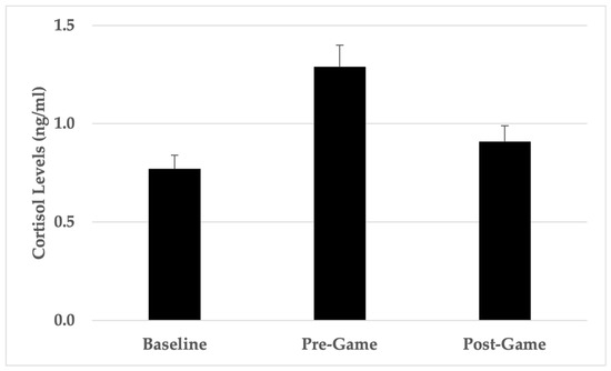 Repeated measures t-tests showed a significant increase in cortisol concentrations from baseline to pre-game, t(65) = −3.97, p < 0.001, d = −0.62 (moderate effect), and a significant decrease from pre-game to post-game, t(65) = 3.48, p < 0.001, d = 0.42 (moderate effect). No significant difference between baseline and post-game cortisol concentrations was reported, t(65) = −1.91, p = 0.06, d = −0.28 (small effect), (Figure 3).