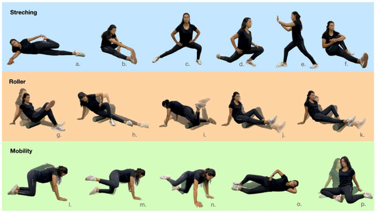 Exercises performed in each recovery strategy, presented in the order of execution. (a–f) passive stretching exercises focused on quadriceps, hamstrings, adductors, hip flexors, calf muscles, and gluteus; (g–k) foam rolling exercises applying self-massage over the anterior, posterior, and lateral regions of the thighs and legs (initial and final position); (l–p) lumbopelvic mobility exercises (initial and final position).