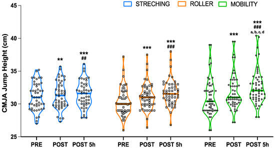 Mean (wider horizontal line) and SD (dashed horizontal lines) of vertical jump height before (pre), immediately after (post), and 5 h (post 5) post-recovery strategy for the three interventions (stretching, blue; foam roller, orange; and mobility, green), including individual responses (plots). * Significant (p < 0.05) intragroup differences compared to the pre-measurement, where ** means p < 0.01 and *** means p < 0.001, # Significant (p < 0.05) intragroup differences compared to the post-measurement, where ## means p < 0.01 and ### means p < 0.001. a, Significant (p < 0.05) intergroup differences compared to the pre-measurement in the stretching condition. b, Significant (p < 0.05) intergroup differences compared to the post-measurement in the stretching condition. c, Significant (p < 0.05) intergroup differences compared to the pre-measurement in the mobility condition. d, Significant (p < 0.05) intergroup differences compared to the post-measurement in the mobility condition.Regarding wellness perception, the statistical analysis revealed significant effects (p < 0.001, F = 30.3). Thus, post-hoc analysis showed significant increases in wellness perception after both roller (mean [p, t]: 0.75 [p < 0.001, t = 6.28]) and mobility recovery protocols (0.90 [p = 0.012, t = 7.65]) compared with stretching. Although the effect size with respect to the stretching protocol was higher after mobility (ES = 0.94 vs. ES = 0.88), no between-group differences were observed between the mobility and roller protocols.