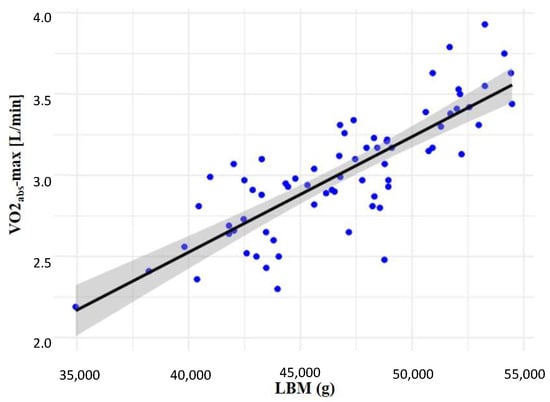 Correlation between LBM and VO2abs-max. Abbreviations: LBM: lean body mass; VO2abs-max: maximal absolute oxygen consumption.