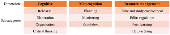 Dimensions and subcategories of learning strategies: cognitive, metacognitive, and resource management.