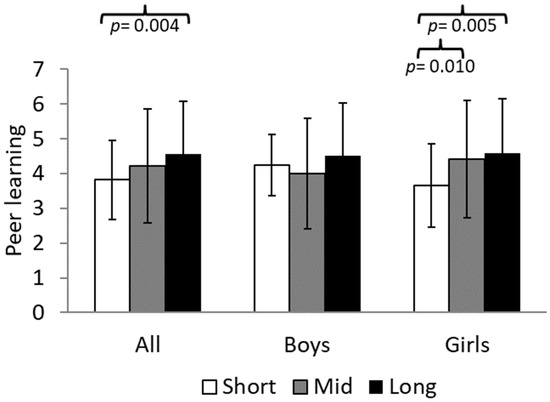 Comparison between the groups that spent short time (<14 h 42 min per day) vs. mid time (14 h 42 min–15 h 30 min per day) vs. long time (>15 h 30 min per day) in light HR with the peer learning factor of the MSLQ differentiated by sex.