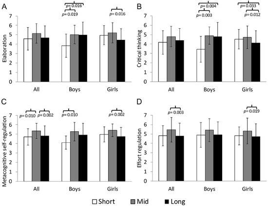 Comparison between the groups that were short time (<46 min/day) vs. mid time (46–62 min/day) vs. long time (>62 min/day) at moderate HR with the factors of (A) elaboration, (B) critical thinking, (C) metacognitive self-regulation and (D) effort regulation of the MSLQ differentiated by sex.