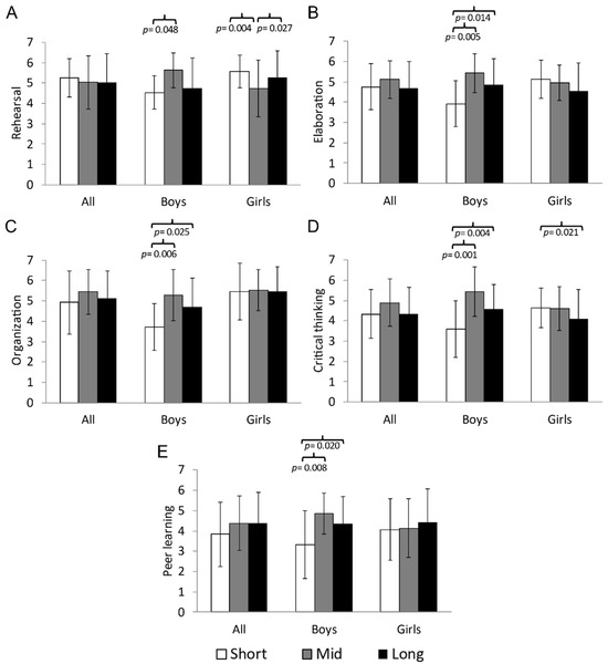 Comparison between the groups that spent short time (<3 min/day) vs. mid time (3–6 min/day) vs. long time (>6 min/day) at vigorous HR with the factors of (A) rehearsal, (B) elaboration, (C) organization, (D) critical thinking, and (E) peer learning of the MSLQ differentiated by gender.