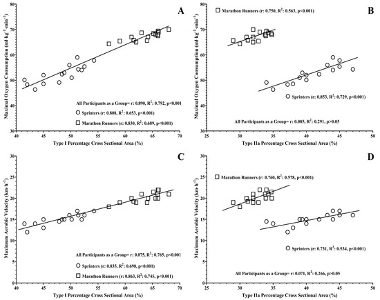 Correlation plots between vastus lateralis percentage areas occupied by Type I, IIa muscle fibers, estimated maximum oxygen consumption (A,B) and maximum aerobic velocity (C,D) for all athletes as one group (n = 30) as well as separately for Sprinters (n = 15) and Marathon Runners (n = 15).