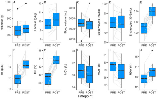 Hematological values before (PRE) and on last day (POST) of exposure to 2320 m of altitude. (A): absolute total hemoglobin mass (g) (p = 0.013, ES = −0.21); (B): relative total hemoglobin mass (g/kg) (p < 0.001, ES = 0.50); (C): absolute blood volume (mL) (p = 0.316,ES = 0.21); (D): relative blood volume (mL/kg) (p = 0.798, ES = 0.05); (E): erythrocytes (p < 0.001, ES = 2.48); (F): hemoglobin concentration (p < 001, ES = 2.14); (G): hematocrit (p < 0.001, ES = 2.69); (H): mean corpuscular volume (p < 001, ES = 0.51); (I): mean corpuscular hemoglobin (p < 0.001, ES = 0.72); and (J): red cell distribution width (p < 0.001, ES = 1.21). Grey lines show PRE and POST values for individual participants.