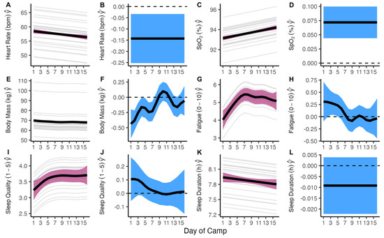 Changes in daily assessment variables across 16-day camp. Model estimates ( and simultaneous 95% confidence intervals are expressed at population level (black line and pink ribbon), and participant level (grey lines). First derivative estimates and their simultaneous 95% confidence intervals (black line and blue ribbon) show the rate of change in the response variable at a given timepoint. (A,B): resting heart rate; (C,D): resting peripheral oxygen saturation; (E,F): body mass; (G,H): Rating of Fatigue; (I,J): sleep duration; and (K,L): sleep quality.