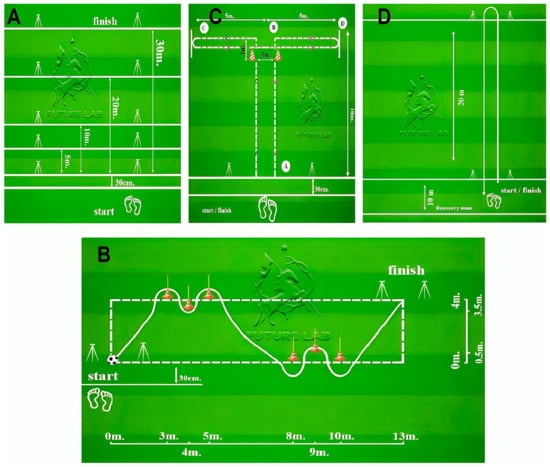 Layout for speed testing—5, 10, 20 and 30 m sprint (A), dribbling speed and change of direction and dribbling (B), T-drill (C) and RSA-test (D).