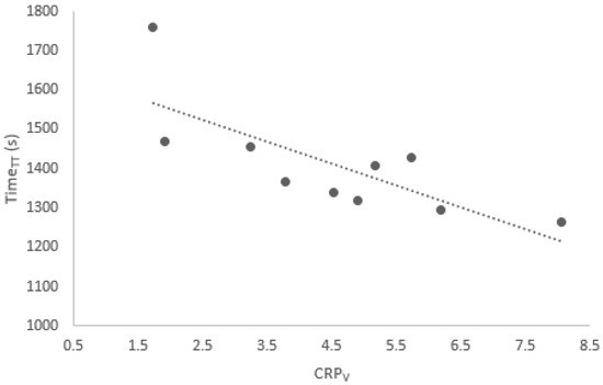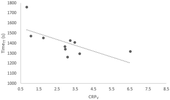 Correlation between TimeTT and CRPV for hip–knee coupling at 15 min, for all participants during the “Drive” phase (r = −0.666).