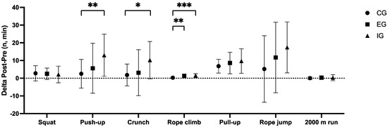 | Push-Up (n) | CG | 33.9 ± 11.9 | 36.9 ± 10.6 | 2.5 ± 8.1 | 0.124 |
