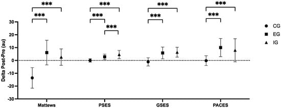 | PSES (au) | CG | 14.7 ± 4.2 | 14.7 ± 3.9 | 0.0 ± 1.3 | 0.492 |