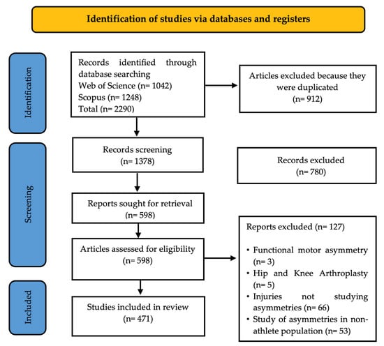 To select the most important and relevant studies related to the topic selected, several inclusion criteria were established: (i) studies of asymmetries in athletes in the respective categories (training, specialization, and/or elite); (ii) original full-text peer-reviewed studies; (iii) studies with access to the full document to complement the initial review; (iv) documents without language restriction; (v) studies with a publication date between 1 January 2015 and 15 June 2024; and (vi) studies from journals indexed in the Journal Citation Report (JCR). The exclusion criteria were as follows: (i) studies evaluating functional motor asymmetries; (ii) studies evaluating asymmetries in high school and/or university students who practice sports; (iii) injury studies not considering asymmetries; and (iv) studies evaluating imbalances but not considering asymmetries. These criteria respond to the need to be able to investigate the effects of asymmetries in sports performance.