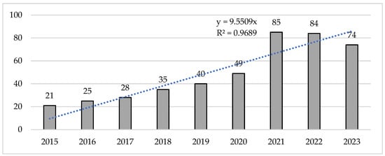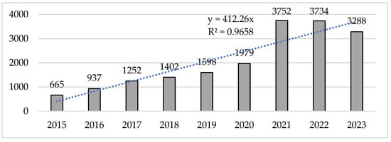 On the other hand, the number of citations per year showed an exponential increase, especially between 2021 and 2022, which were also the years with the highest number of citations received (Figure 3). With respect to the total number of citations received by the studies in each of the years, a significant increase was observed, with 2021 and 2022 receiving totals of 3752 and 3734 citations, respectively. This increase in the number of citations allowed us to perform a collective analysis of the sample, which evidenced an exponential increase of 464.21% when comparing the citations received in 2015 and 2021, which was the year of the highest number of citations.