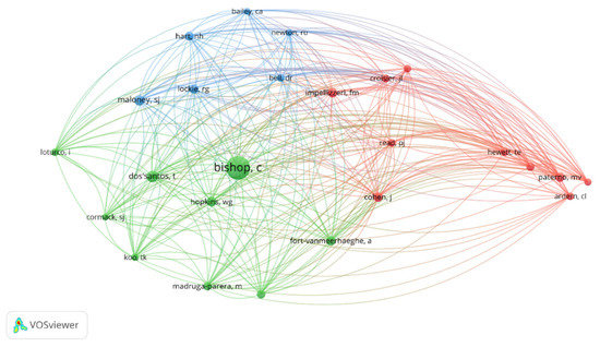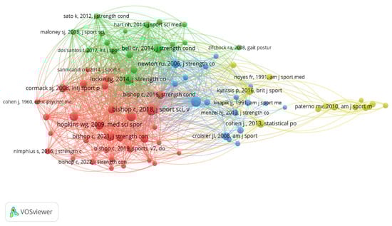 The citation analysis of a cited author determined that of the 6679 identified authors, only 25 met the criterion of a minimum citation threshold of 60. Figure 7 highlights three strong nodes, with the green node being the strongest, led by “Bishop, C.”; the red node led by authors such as “Impellizeri, F.”, “Read, P.”, and “Paterno, M.”; and the blue node, the weakest of the three identified, consisting of “Maloney, S.”, “Lockie, R.”, and “Hart, N.”. Figure 7 reveals how there are three major nodes for the citation of a cited author, highlighting the green node centralized by Bishop, which, in turn, establishes connections with all the other authors.