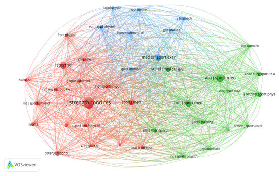 For the analysis of cocitations of the identified journals, a minimum of 100 citations was established for inclusion in the analysis. Of the 2052 journals identified, only 38 met this threshold. The journals Journal of Strength and Conditioning Research (2380 citations), The American Journal of Sports Medicine (1205 citations), British Journal of Sports Medicine (822 citations), and Journal of Sport Sciences (809 citations) stand out. Figure 5 shows three major nodes, with different colors highlighting the cocitation interactions between journals.