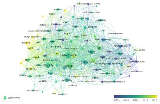 For the keyword analysis, each term was required to have a minimum occurrence of 10. Of the 1635 collected keywords, only 102 met this criterion. The most frequently occurring keywords in the studies were “Performance” (n = 162), “Strength” (n = 167), “Reliability” (n = 118), “Injury” (n = 94), and “Asymmetry” (n = 90). Over time, the oldest concepts included “Imbalance”, “Soccer players”, “Muscle”, “Knee”, and “ACL reconstruction”. Moreover, between 2020 and 2021, the most referenced terms were “Performance”, “Injury”, “Return”, “Asymmetry”, “Symmetry”, and “Reliability”. The most recent terms used to study asymmetries in sports performance include “change of direction”, “sprint”, “speed”, and “physical performance” (Figure 8).