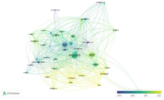 The countries with the highest number of published documents were England (140 documents and 3039 citations), the United States (94 documents and 2099 citations), Qatar (40 documents and 1530 citations), and Spain (90 documents and 1023 citations). In 2019, the countries with the most development were Slovakia and New Zealand. Between 2019 and 2020, the United States showed significant production, while between 2021 and 2022, there was a considerable increase in scientific output, led by England, Spain, Brazil, Italy, Canada, and Portugal. Finally, the 40 identified countries are spread across different continents, with Europe showing the greatest development, whereas Africa and Asia have lower levels of production. The different-sized nodes represent the countries, and the colors represent the interactions produced between them over time, with the darkest colors representing the countries that received the most citations in 2019–2020, and green and yellow represents those that received the most recent citations in 2022 (Figure 10).