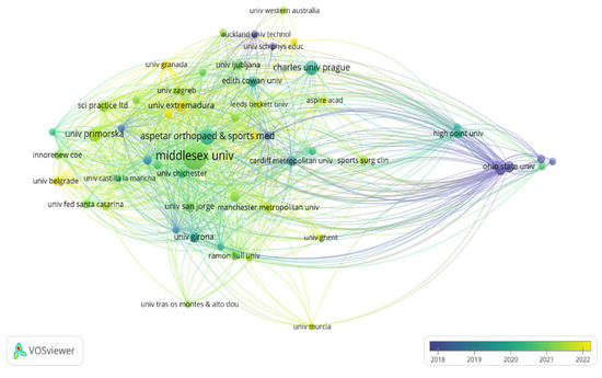 Visualization of maps and clusters of most productive organizations/institutional affiliations related to study of asymmetries in sports performance.