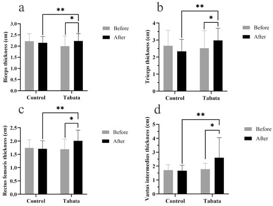 Biceps muscle thickness (a), triceps muscle thickness (b), rectus femoris muscle thickness (c), and vastus intermedius muscle thickness (d) of participants in control and Tabata groups before and after 12-week intervention. *: p < 0.05 vs. before intervention, **: p < 0.05 vs. control group.