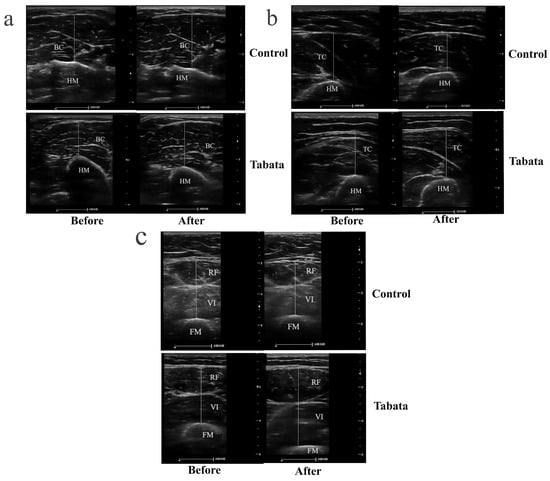 Ultrasound images demonstrating muscle thickness of participants in control and Tabata groups before and after 12-week intervention. (a) Transverse scan of biceps muscle (BB), with the hyperechoic, curvilinear structure in the lower part of the image representing the humerus (HM). (b) Transverse scan of triceps muscle (TC), where the hyperechoic, curvilinear structure in the lower part of the image corresponds to the HM. (c) Transverse scan of quadriceps muscle, comprising rectus femoris (RF) and vastus intermedius (VI); the hyperechoic, curvilinear structure in the lower part of the image represents the femur (FM). Solid straight lines indicate the method used to measure the thickness of each muscle.